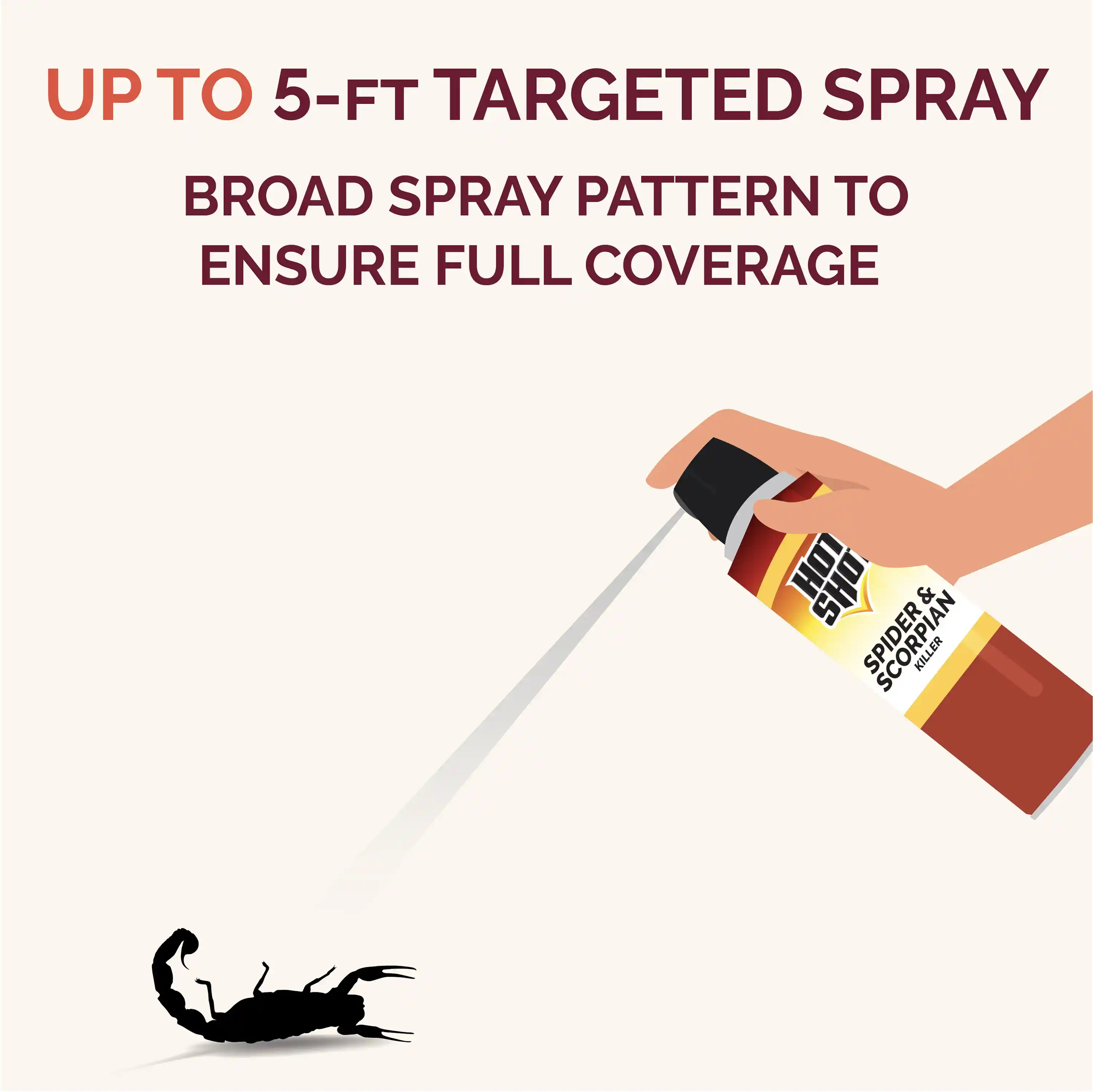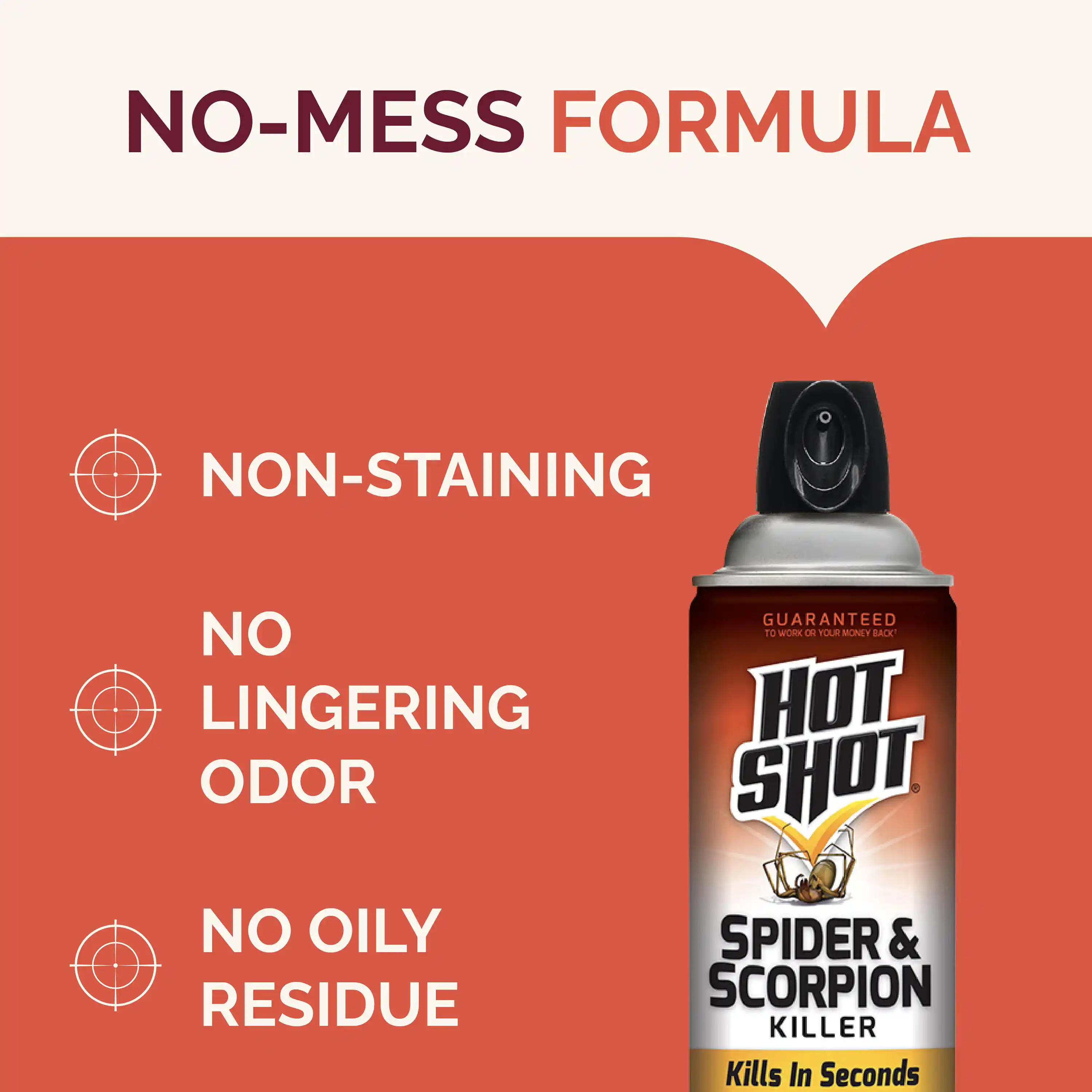 Show bugs who's boss with Hot Shot® Spider & Scorpion Killer. This fast-killing formula stops bugs in their tracks. Specifically formulated with a higher active ingredient level to kill scorpions and larger spiders, it kills large spiders, including black widow, brown recluse and wolf spiders, scorpions, ants*, cockroaches and brown dog ticks in seconds and continues to kill pests** for up to 4 months. This effective spider killer also kills black widow spiders as they hatch. The water-based, clear formula provides indoor and outdoor pest control with no mess, no lingering odor or oily residue when used as directed. The aerosol formula provides a targeted spray up to 5 feet. The broad spray pattern ensures full coverage.Use indoors as spot treatment along/behind baseboards, around/beneath appliances, sinks, and other areas where bugs may hide. Always read entire label before use. Follow all directions and precautions.